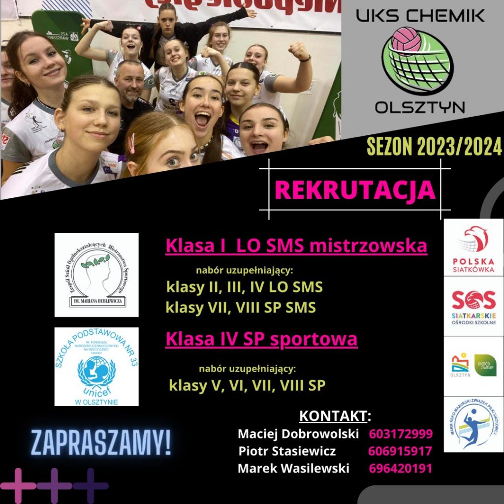 Dodatkowo zachęcamy do aplikacji do klas II, III, IV LO w ramach naboru uzupełniającego. W ofercie posiadamy również kilka miejsc w klasach VII i VIII SMS interdyscyplinarnych z realizacją programu szkolenia w grupie treningowej wspólnie z uczennicami LO