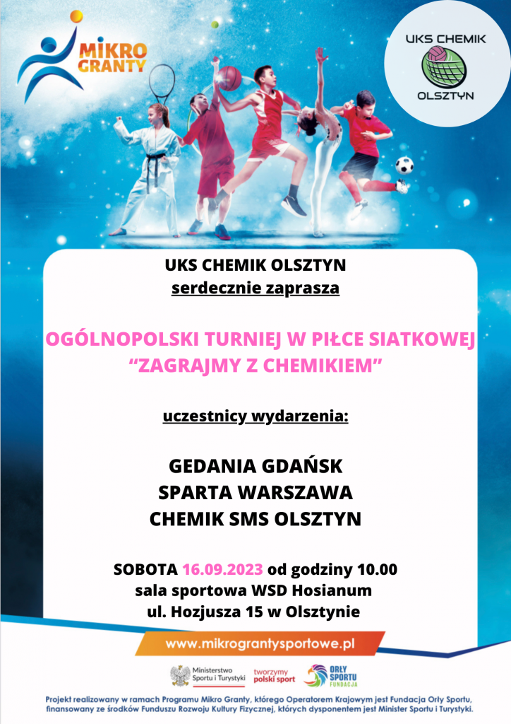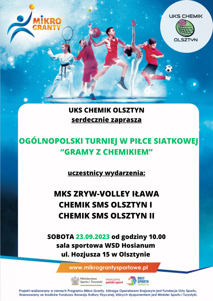 Serdecznie zapraszamy na Ogólnopolski Turniej w piłce siatkowej „Zagrajmy z Chemikiem”, który odbędzie się już jutro (16.09.2023 roku) od godziny 10.00 w sali WSD Hosianum przy ul. Hozjusza 15 w Olsztynie.