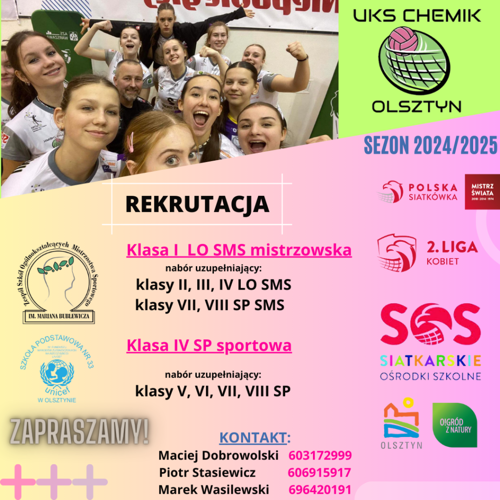 UKS Chemik SMS Olsztyn serdecznie zaprasza dziewczęta do patronackich klas sportowych w Szkoła Podstawowa Nr 33 w Olsztynie oraz klas mistrzostwa sportowego w ZSO nr 5 Mistrzostwa Sportowego imienia Mariana Grzegorza Bublewicza